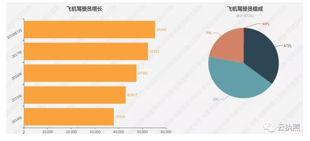 根据民航局云执照桌面系统中驾驶员数据,截至2018年7月20日,我国驾驶员执照总数为59064本,其中私用驾驶员执照3620本,商用驾驶员执照30754本,航线运输驾驶员执照23647本,多人制机组驾驶员执照184本,运动执照859本。 表1 驾驶员执照总数及递增统计表(2018年7月) 表2 驾驶员执照数量统计表(飞机和直升机类) 图1 驾驶员执照数量及增量图 按照飞机和直升机进行不同类型驾驶员执照数量分别统计如下: 图2 飞机驾驶员执照增长及组成统计图 图3 直升机驾驶员执照增长及组成统计图 民航飞行教员等级持有人数量统计如下: 表3 飞行教员等级持有人统计表 根据“云执照桌面系统”采集的数据,6月份我国121部运输航空公司的机长和副驾驶数量、5月份的各公司空地小时数和疲劳系数统计分别如下图表所示: 表4 运输航空公司机组实力统计表 5 各运输公司疲劳系数统计图(5月) 通用及小型运输航空公司2018年度各月份驾驶员数量及截至7月各类型执照比例统计如下图所示: 图6 通用及小型运输公司驾驶员统计图 按照七个管理局分别对所在地区管理局的通航驾驶员数量统计如下图所示: 图7 各地区管理局通航飞行员分布图 图4 各运输航空公司空地小时统计图(5月)